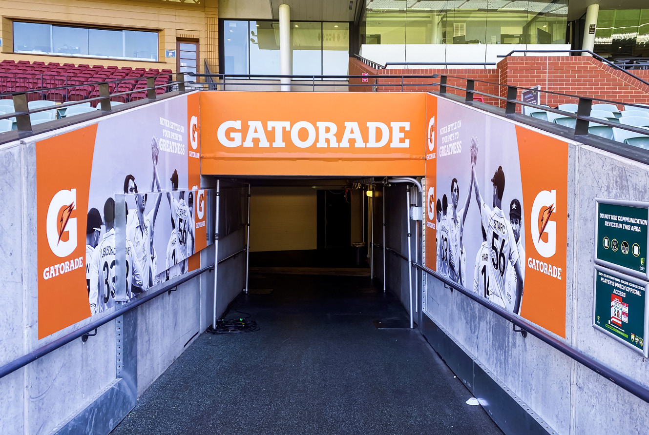 The walkway print asset refers to the printed signage located along the player walkways around the stadium.